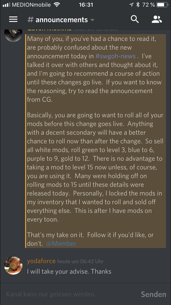 Is it telling us it’s a good idea to level up colored mods before patch? Doesn’t make sense why any different waiting. Leave some greeens, blues etc at Lv1 as they are wouldn’t affect them would it post patch?