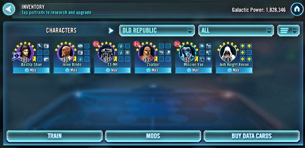 Bastila Jolee and Borrowed Revan are all thats really needed. But you will need to level them up a bit because not all characters are needed for each phase. I think I got their abilities to lvl 4 or 5. They werent well modded either, just random. I auto'd the event except second to last tier.