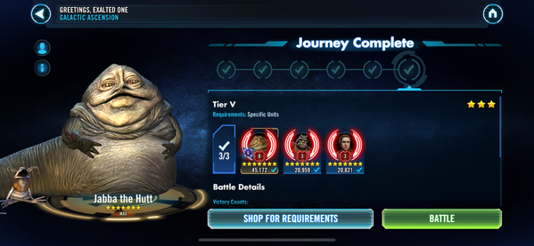 I was hoping that this dev announcement was correct, but unless my account is some weird edge case, then the server fix is either not live yet or not working for my account. https://forums.galaxy-of-heroes.starwars.ea.com/discussion/266314/jabba-journey-guide-update-10-10#latest - EnigmaPotatoes2 years agoSeasoned Ace