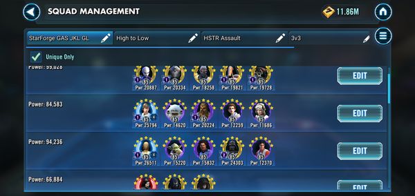 Ok.- wildmannz6 years agoRising VeteranOk. Easy solution. Make a squad load out tab (I called mine JKL Farm) and put the toons in two squads. That way you can see them all in one place. It’s a much easier way than the JG imo.