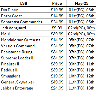 I can't seem to see any LSBs in the webstore for some reason, but thankfully I'm on PC and they have appeared early there. I don't think any LSBs are being released today (4th) which is odd, but some more are out tomorrow (again, PC version only for a few days). Here's the schedule as far as I'm aware.