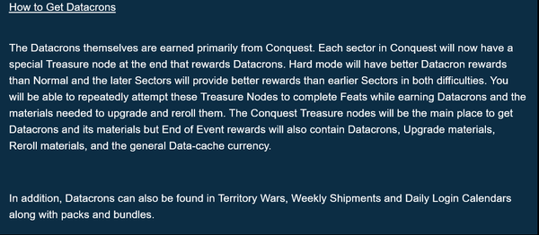 As to Datacrons...like many i am wary and not convinced...but i will wait to take a look and epxeriment before going on a rampant complaint spree...players keep asking for content...and then complain for pages every time new content is added...BEFORE EVEN EXPERIMENTING...very puzzling to me...