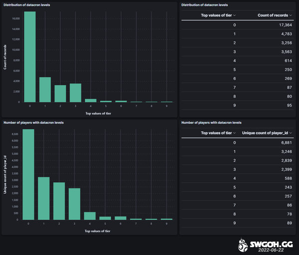 Numbers aren't accurate since 322k players signed up for GAC (so there is no way only ~15k players have datacrons) but gives you a good estimate on the 15k sample size, how many are engaging in datacrons and to what level