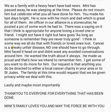 So far the community has helped to raise $13,600!! Let's see how much more we can raise. If you can't make it and would like to donate the link can again be found here: https://tiltify.com/@bountyhunnies/swgoh-community-for-mini