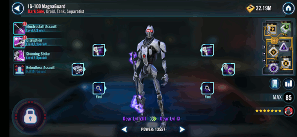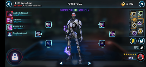 1. Favourite icon is significantly more difficult to distinguish between on/off. 2. When an ability is maxed, it dims the second line which also contains the Basic, Special, Unique, Leader tag, which is arguably more important than the name of the ability itself. I'd take a cue from ships and move the ability level into the icon's lower corner, so it's either a #, an omega, a zeta, or a checkmark (for maxed non-zeta/omega abilities). Then brighten up the ability type tag so it's as visible as the name. 3. No Find button is bad. Remove the mini-potrait beside the stars and replace with find. 4. Jumping to the mod screen seems to have a mod initially selected, showing its stats instead of the heroes stats and the Loadout button. I'm guessing this is a bug and not intended. 5. Mod loadout on main screen is small enough on a phone that it's very difficult to distinguish certain set types, especially if it's purple. 6. Use of space on a rectangular phone is pretty bad. Lots of empty space with tons of stuff crammed at the edges. Relic and ship button seem like they could fit nicely under each set of 3 gear slots. Instead the relic causes most Legendary and HJ heroes' abilities to scroll.