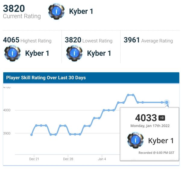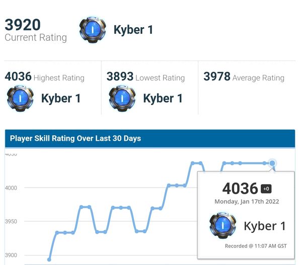 Not sure how I feel about the squishing. New kyber 1 threshold is 3610. So I need to go 2-1 in the first week not to be demoted. If I go 1-2 I’ll be 8-7 overall. It’s also possible I get demoted going 2-1 though that should increase my rating enough to stay in kyber 1. I was at 3608 before squishing iirc I am now 3578. This is a jump of 70 points to the threshold.