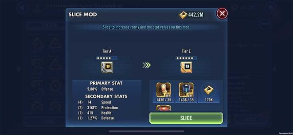 - I've only been playing 6 months so not a true vet but mods are the single most frustrating thing about this game to me. They're so RNG dependent (not just finding speed stats but how much/often they increase) and this adds another layer of RNG to them. As a concept; slicing seems to be a good way of introducing 6 dot mods without invalidating 5 dot mods but this is just going to be ridiculous bringing one set of mods up to 6 dot let alone an arena teams worth of mods with the current drop rate.