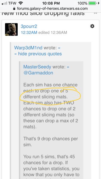 I’ve gotten 33 mod slicing materials... that’s using three 50 energy refreshes today/yesterday. 33 doesn’t seem that bad depending on how much we need to upgrade a mod.