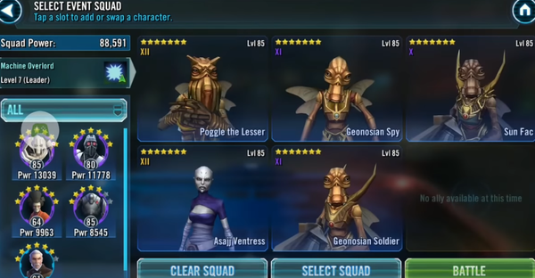 - I was able to beat tier 5 with dooku(g11) lead, g12 assaj, g9 B2, g8 sun fac and g9 grievous. The key for me was to keep spamming B2's buff immunity as much as possible and to kill padme then the jolee knock off first