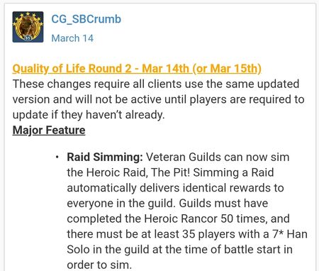 As it is, the raid is more stress than fun. You have to finish top3 to get decent levels of g12, but finishing top3 is more luck than anything - everyone at my level has JkR, Anakin, and NS. Since it's mostly luck anyway and since I'm not having fun, I'd be happy to have HSTR become simmable.