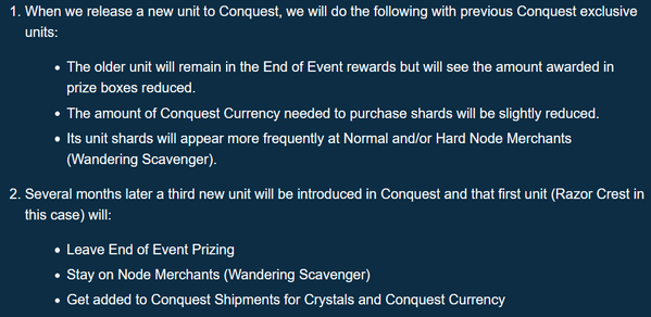 Next will be Conquest rewards, then after they have been out for a year, they will possibly moved to an event or something, but no not a hard node.- I'm actually hoping they wait a couple of conquests before introducing a new character. I'd like to be able to work on some gear with the conquest currency after focusing solely on a character with all the currency.
