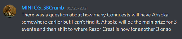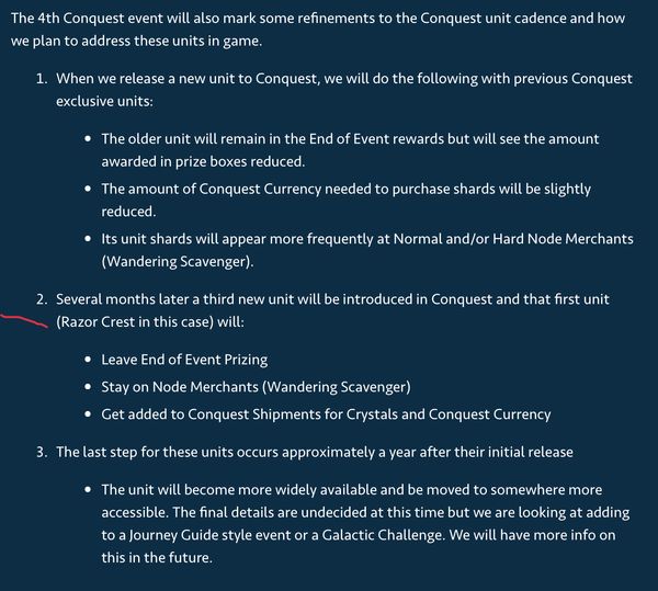 Nice! Thanks everyone!! The reason i was asking is cuz if there are 2 more conquests with 44 razor crest shards in the red crate, then we would only need to buy 1 more 5 pack to get it to max stars. Assuming you are all at the same 50/85 that i am currently. This event would take us to 9/100 and then two more red crates after would be 97/100.