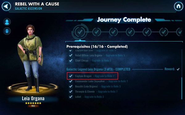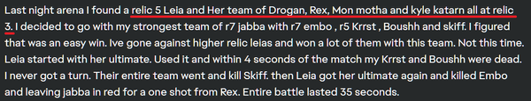 Last night arena I found a relic 5 Leia and Her team of Drogan, Rex, Mon motha and kyle katarn all at relic 3. I decided to go with my strongest team of r7 jabba with r7 embo , r5 Krrst , Boushh and skiff. I figured that was an easy win. Ive gone against higher relic leias and won a lot of them with this team. Not this time. Leia started with her ultimate. Used it and within 4 seconds of the match my Krrst and Boushh were dead. I never got a turn. Their entire team went and kill Skiff. then Leia got her ultimate again and killed Embo and leaving jabba in red for a one shot from Rex. Entire battle lasted 35 seconds.
