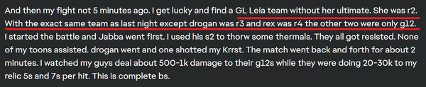 And then my fight not 5 minutes ago. I get lucky and find a GL Leia team without her ultimate. She was r2. With the exact same team as last night except drogan was r3 and rex was r4 the other two were only g12. I started the battle and Jabba went first. I used his s2 to thorw some thermals. They all got resisted. None of my toons assisted. drogan went and one shotted my Krrst. The match went back and forth for about 2 minutes. I watched my guys deal about 500-1k damage to their g12s while they were doing 20-30k to my relic 5s and 7s per hit. This is complete bs.