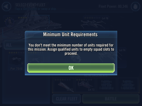 In this update, you will see a Ship PvE table called Fleet Battles, but it is currently locked. We’re very close to finalizing the content, but changing the core experience required a tremendous amount of work and we still need some time to finish Fleet Battles. We are currently targeting a late June release of Fleet Battles. Fleet Battles will have its own energy and will be one of the locations where players can get Ship Omegas, Reinforcement Materials, and grindable locations for other ships/characters and gear. When Fleet Battles go live we will retire the Cantina Table node that supplies Reinforcement Materials.