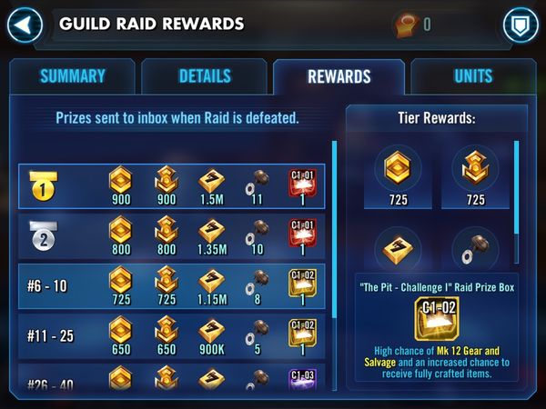 The Challenge Tier for The Pit raid requires a high level Guild to work closely together in order to complete. While the rewards will help you power up your squads even further, the event is intended to challenge a guild as whole. As a result, it will be very difficult for a player or even a handful of guildmates to complete. Similar to Heroic Raids, Guilds will have 48 hours to complete this event. Since the Challenge Tier is designed to require cooperation, we have opted for a flatter prizing structure to reduce some of the friction in-guild while still acknowledging degrees of participation and success. In short, every player who participates will earn the new Level 8 Relic Amplifier material, Aeromagnifiers.