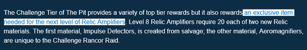 The Challenge Tier of The Pit provides a variety of top tier rewards but it also rewards an exclusive item needed for the next level of Relic Amplifiers. Level 8 Relic Amplifiers require 20 each of two new Relic materials. The first material, Impulse Detectors, is created from salvage; the other material, Aeromagnifiers, are unique to the Challenge Rancor Raid.