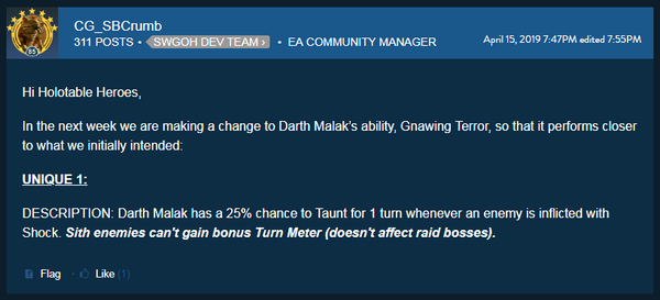@CG_SBCrumb -- can you please clarify the update? Is it that sith enemies only don't gain tm when inflicted with shock or as long as Malak is on the field? Additionally, how does this interact with his Jaws of Life zeta? Now, if the other side has Malak, can he still gain the bonus turn?