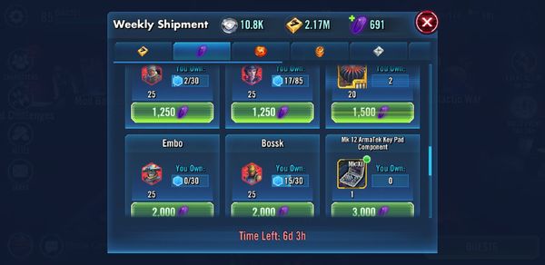 Weekly Shipments will refresh once a week with some pretty good stuff. Some things for credits, crystals but more importantly Ally Points. Right now you can get 2 Omegas if you have a bunch of Ally Points stashed. The contents of the store might not change week to week when it refreshes but we are planning to change it around regularly. The ultimate goal is to have stuff in the store that's relevant to what's happening in the game each week but for now the inventory is going to rotate every couple weeks