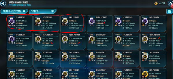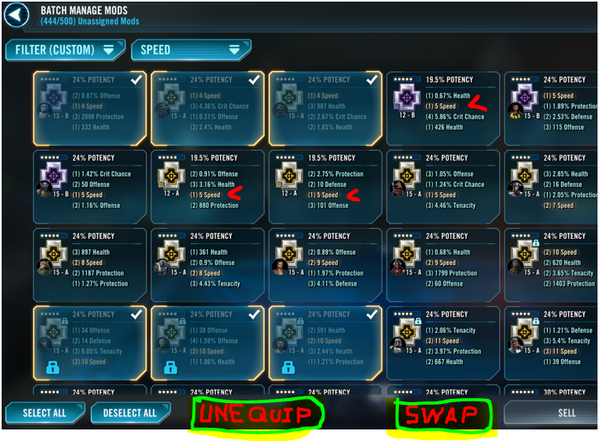 NOW, if I want to replace those 3 slowest mods at 4 speed w/ any of the 5-8 speed mods that are Unequipped at the moment, I have to write down/memorize each of those characters, back out of the Mods Screen, go BACK INTO the character roster screen, hunt down those characters ONE AT A TIME, and unequip each of those Mods singly.