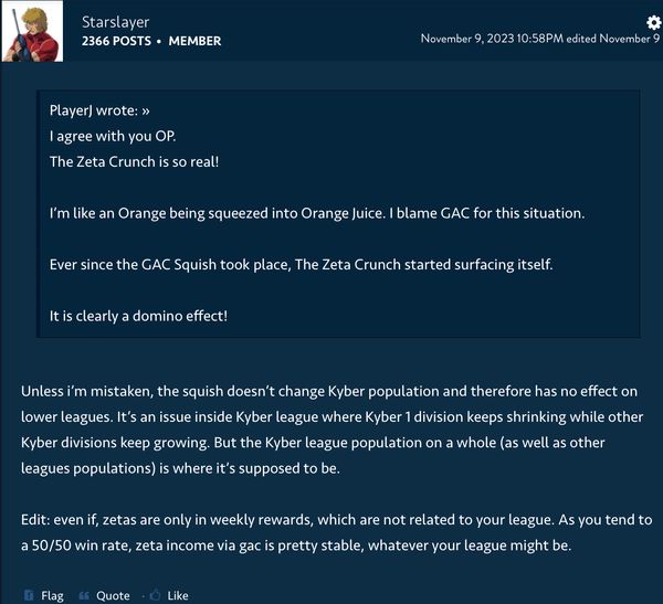 I am playing for almost 3 years now ftp (in January), I have 1 GL and 2 GL ships on 7 stars (Prof and Levi) and I am almost done with the next GL. I have 6.8 M GP, I get first place in fleet every day for almost the entire time since I unlocked fleet Arena so I actually have a "higher" Zeta income than others and as I said, I still have a big Zeta problem and I see no change in the near future. I would not consider myself an early player. As I stated before (in another thread), the Zeta catch up or even the ability to save them is something, that only happens when you already have almost every character, that needs a Zeta, equipped and don't have to level many new characters. Which invmy opinion is endgame.