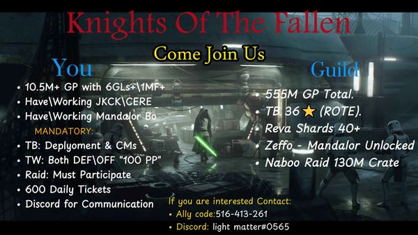 Recent DiscussionsKraytDragonPearls Looking to add 2 We are a laid back guild without a bunch of rules on how you should play and we are searching to add 2 to our guild. We only have 2 rules...TW is optional but if you join you must participate. Three ...Australian Republic Order (New Guild Looking To Grow) Are you looking for a new guild to grow with? Become a member of the tribe in the new Australian Republic Order!!! Currently 101 mil GP with 15 members so far! What we are looking for: Active ...BOOZE BLASTERS BOUNTY Guild - recruiting (We've been a guild since the beginning... 2016) We are recruiting players of ALL LEVELS. We are just looking for cool and mellow players that enjoy the game and fun minded people! Come be part of...The Great Forge Alliance is recruiting for The Beskar Legion. The Great Forge Alliance is recruiting for The Beskar Legion. Looking for active members that want a supportive community, both Casual and competitive. 🔘 275+ Mill GP ALLIANCE 🔘 We get upward...THE FALCON PIT CREW 2 spots just opened up. Join us if ur active and wanna grow. Good squad we have. Let's grow together