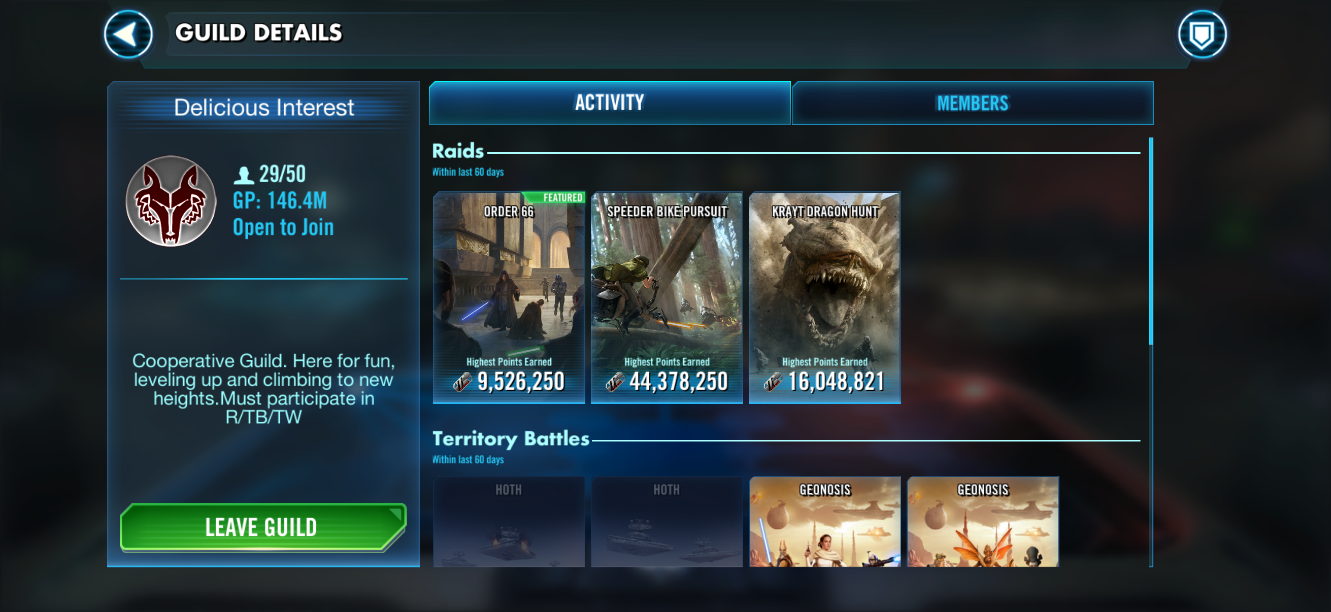 Delicious Interest is a laid back but active guild looking to get back to running RotE territory battles soon, running the Order 66 raid now! Lots of high GP members, recent decline due to busy schedules, but we have new management (me) and are going to climb to being a competitive, yet laid-back, guild in 2026!