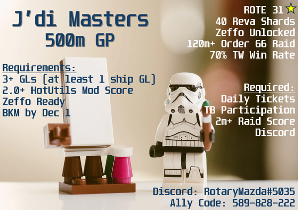 Recent DiscussionsDutchJedi 344M Nederlandse guild 19*RoteWe throw lightsabers; you can tooSmall Guild Recruitment: Dark LegacyYBP- 420m+ GP, 90% TW, 30 ⭐️ ROTE, 30+ Reva, 7th crate O66 (100m+)Mandalorian Vanguard. 640 mil GP. US Based. Open for new teammates!