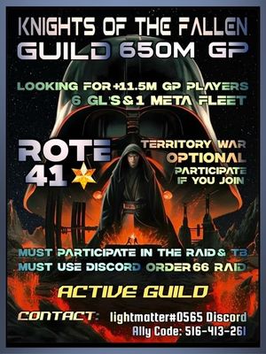 Recent DiscussionsRecruiting players Come join my new quild started jan 2026. No discord needed and never will do the chat in game is good enough. So if looking for an active and hopefully becoming a good quild join NEW OLD CAR MPH .tha...Looking for new guild? Do you have 8m+ GP? Got 2 or more galactic legends? We are a drama free 500m+ GP guild (-2 players) within an alliance of six guilds. ROTE: 34 stars and on average 23 Reva shards. Pushing to unlock Zeffo at the moment. TB is our priority. Order 66 R...Makashi Marauders 620M GP, 39* RoTE, 245M O66 Box https://swgoh.gg/g/ZKPepsHXQLCs6d0CBztZXw/ **Makashi Marauders** is a proud member of Boba’s Alliance 😎 All guilds operate independently, but share alliance resources. **About us:** 💥 618M guil...LordsofKorriban - 252M GP, LF active long term members Active, friendly, and helpful core group of 33/50 members. 252M GP and 7.64M avg GP. We are well over 300M gp when fully rostered. We did an inactive flush and need to fill our ranks again with acti...Join Nightstalkers NS .gg https://swgoh.gg/g/3_qBMyXVT6ar7WUPVO2o8Q/ __## NIGHTSTALKERS NS: ##__ We are a growing and active guild, 250+ mil GP (40+ current members), Looking for players who would like to grow with us...