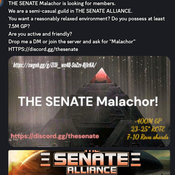Join THE SENATE ALLIANCE! 23+1 guilds under one galactic alliance, one of the largest & strongest in SWGOH! Slots available in THE SENATE Malachor. Join us and fulfill your destiny!