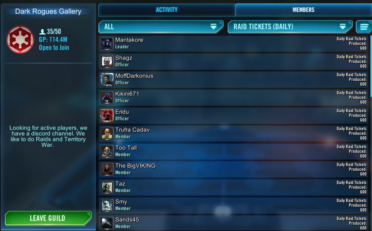 We are a a 380+ GP group of actives, seeking like-minded members @ >5.5m GP. In TB’s, we do: RotE, & both Genos. In raids, we cycle thro Order 66, Naboo & Speeder Bike. Loon Eh? uses Discord, but it is not mandatory.