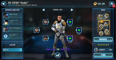 Also, defense on his leader skill seems like an afterthought. This could have been something more useful to increase survivability overall which is a recurring deficiency of most clones. Again, this could have worked with flat defense bonuses (secondary flat defense bonuses are too marginal to have much of an impact). An interesting idea I had was to swap his defense bonus (which is largely ineffective) out for a revive chance based on the number of clone allies alive. Something in the ballpark of ~60% revive would require opponents to choose to focus cody or the other clones first, indirectly making him more survivable. Unlike other self revive toons (HK, Boba), Cody actually can do some damage and poses a real threat if not dealt with.