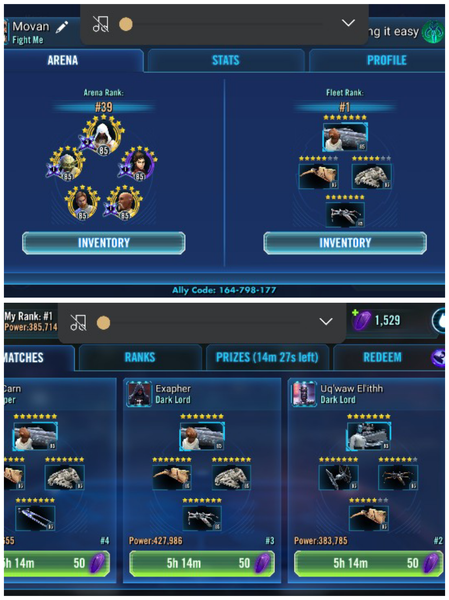 Here is a screen with all 3 meta fleets with me at 1 and the others at 2,3,4. Yes they are maxxed fleets. In fact, as I said in another thread recently, I think it is easier to kill Bistan fleets than the others with a slower Akbar. If I can't cleanse breach then the AI reinforces with their Biggs and calls mass assist and kills the breached tank. Then I follow with Cassian and their Falcon dies. Then its game over for them. The Tie/Poe and HT/Biggs versions are much more burstyy and random fights.