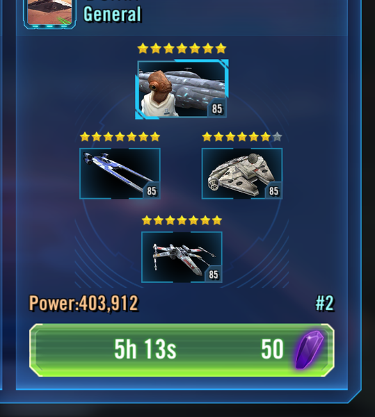 thanx for the order of operations...been doing this since first week of release(5* at that time). is much easier now that 'almost' maxed. bistan fleets are way too squishy in my shard and much more rng due to biggs(usually) not lasting opening salvo. it's not that i don't win 75%-80% of the time(the AI isn't as good as a player), it's that those losses sometimes comes in 2's or 3's in a row because of no assists...yep that's zero...NO amount of gear, zeta's, ability mats, wishful good vibes will change the fact that those assists are 50/50, coinflip, fifty percent chance...pure, unadulterated rng....can u smell the minty freshness?...lol