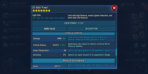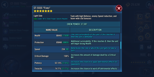 For all the other 501st, that's +150% Health, +140% Protection, +100% Speed, +80?% Offense. It's undispellable and unpreventable for at least 2 of them. It turns Rex from a fragile character to a 70,000 HP, 110,000 Protection beast.