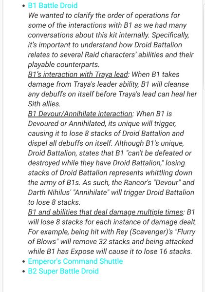 My personal suggestion: allow Annihilate to bring B1’s Droid Battalion down to exactly 1. This would allow for the mechanic to continue and continue the “endless wave of droids” idea and the possibility of B1 “healing,” without really watering-down DN.