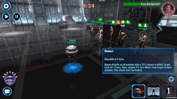FINAL TEXT: Dispel all buffs on all enemies with a 75% chance to inflict Target Lock for 2 turns. Then, remove 5% Turn Meter from Target Locked enemies. This attack can't be Evaded. (Cooldown 4)