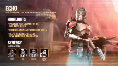 UNIT NAME: Echo ALIGNMENT: Light CATEGORIES: Support, Bad Batch, Clone Trooper, Galactic Republic Loyal Clone Trooper who supports his allies in battle. ABILITIES: Basic: DARING ...