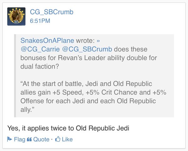 Final Text: (ZETA) At the start of battle, Jedi and Old Republic allies gain +5 Speed, +5% Crit Chance and +5% Offense for each Jedi and each Old Republic ally. Jedi allies begin the battle with Tenacity Up for 1 turn. While Revan is in the leader slot and not the ally slot, units are immune to bonus Turn Meter effects from leader abilities until the start of the first turn of battle.