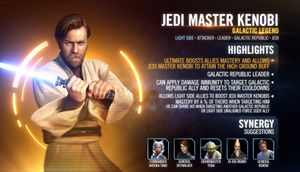 UNIT NAME: Jedi Master Kenobi ALIGNMENT: Light Side CATEGORIES: Attacker, Leader, Galactic Legend, Galactic Republic, Jedi Renowned Jedi Master that provides damage and support throu...