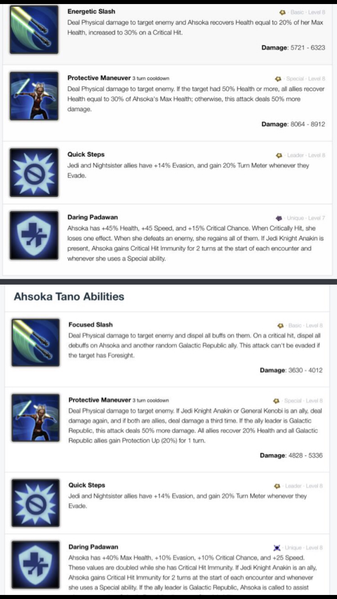 FINAL TEXT (ZETA): Ahsoka has +40% Max Health, +10% Evasion, +10% Critical Chance, and +25 Speed. These values are doubled while she has Critical Hit Immunity.