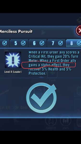 He recovers 5% health and protection whenever he gains a status effect, and he takes minimal damage from things like expose. He's an effective defensive counter to 3PO teams in GA and TW.