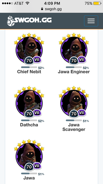 @YKMisfit @shadow87654 These are my jawas. I beat and 3 starred all three tiers of the crit damage mods challenge with them. I had 7 starred them just in case we would ever need them for a C3P0 legendary event. But other than that, that's it. I haven't touched them since the mod challenge. They were 7 star when I beat it, go figure. They all are the same gear level, xp level, ability level, and they have the same mods, etc. So you get the point. lol. ;) I just don't see a need for them in my current roster. That's all. Sorry jawas. Maybe you'll be needed for a C3P0 legendary event. But until then, move along... move along... :sweat_smile: