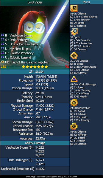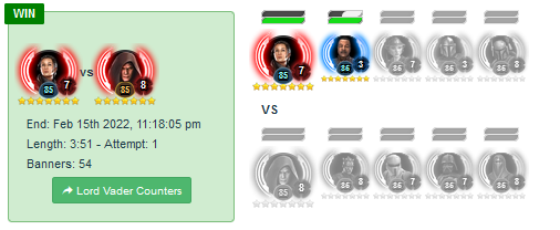 CG, thanks for checking this issue. Since your last update, LV struggles a lot more against other GLs like JMK and JML. I used the same starting squad (LV, maul, RG, DV, piett) before and after against the same squads. Before I won all the time against JMK (GAS, ahsoka, cat, GK) in about 3 min with 4-5 toons surviving at the end. Now, the win rate has dropped significantly and if I win, only LV is alive and I must "auto" the fight if I don't want to potentially timeout.