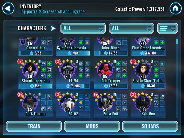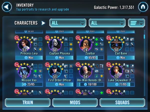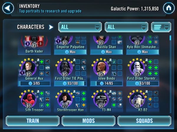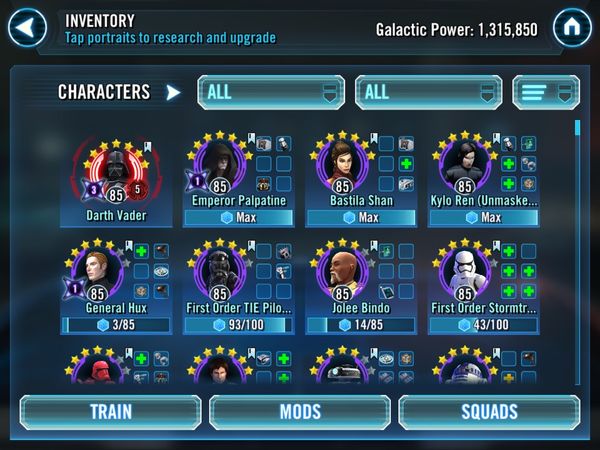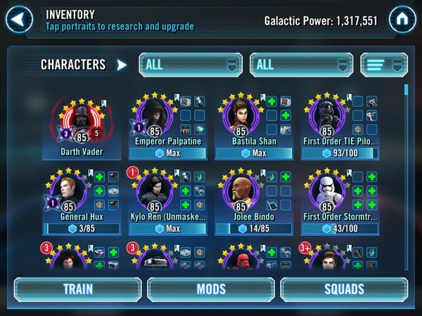 However your Empire faction isn’t good. So to give Vader the supporting cast he needs, it’s necessary to give him at least 2 more good Empire allies. The best choices from what you have at 7* are probably Tarkin, Snow, Storm & Royal Guard. With Palp’s lead, the best choices from that list are ones that assist with Palp’s ability to boost Turn Meter%. Tarkin is the best at that. Snow does not inflict many debuffs, but has his own TM boost ability. Royal Guard inflicts more defuffs than Snow while his health is high, but not so much otherwise. Storm will not assist in keeping the Turn Meter train running, but can protect others when it fails.