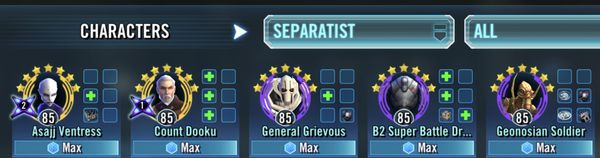 I couldn't reproduce it because I lack the gear and mods for my Asajj. But I think it's pretty telling how reasonable the event is when it can be beaten with one toon. - My strongest Separatists are G12 Asajj, G11 Dooku and G10 Nute. The biggest kick in the teeth is the fact that 2 of these will be reworked AFTER the event.