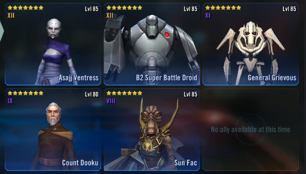 Did Tier 5 & 6 with the following... - I thought tiers 5 and 6 were on the easy side. Especially compared to other recent legendary events. I only have one separatist g12 and neither of the new droids. I used AV, B2, Dooku, G soldier and pogle. I did put my best arena mods on them. B2 is key to keeping that buff immunity on them, especially GKs taunt. I think key was taking Padmé out first. I did it in less than ten tries on 5 and 6 and I def don’t have a supped up roster. It’s doable.