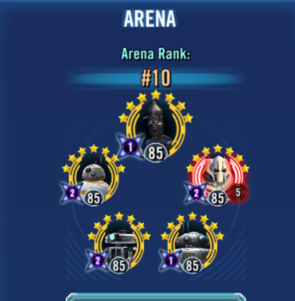 That is definitely arena worthy. My problem is with squads that have G11 IG-88, G10 T3 with two zetas and G8 IPD, which are still climbing with ease."212Attack;c-1965540" wrote: