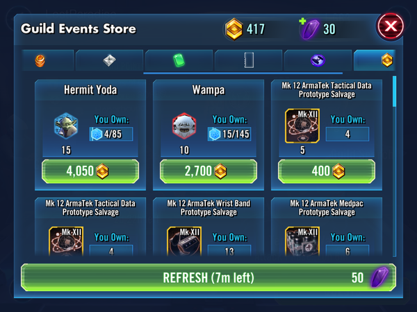 - 7* Wampa and 123/145 Hoda shards. I should get Hoda unlocked next TB as long as we sprinkle in a decent amount of T6 Sith raid in with the TWs in between.