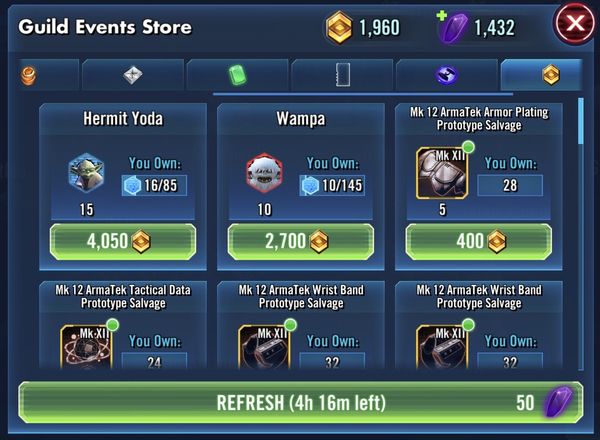 - Have enough GET from today's TW completion to max Hermit Yoda, once the store shows up with the 5 shards for 1350 GET again. Not going to start the Wampa farm any time soon. Now that Yoda is done, I'm going to focus on gear again for a while.
